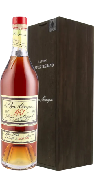 The Bas-Armagnac Baron Gaston Legrand 1967 seduces with its rich and generous nose, where aromas of fresh walnuts, candied prunes, ferns, and vanilla intertwine, enhanced by a touch of dried fruit and sweet spices. On the palate, its round and velvety texture reveals a perfect harmony between fruity sweetness, the warmth of spices and the depth of controlled aging in oak barrels. The long and persistent finish ends with a spicy note and a hint of rancio, confirming its status as an exceptional eau-de-vie, heir to a Gascon savoir-faire preserved with passion.