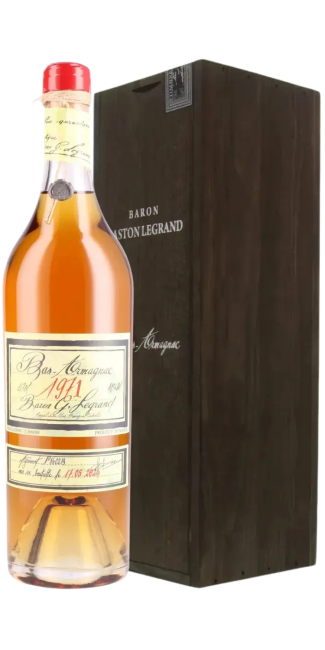 The Bas-Armagnac Baron Gaston Legrand 1971 seduces with its generous and complex nose, where aromas of candied orange peel, fresh walnuts, blond tobacco, and dried fruit intertwine, enriched with a touch of vanilla and roasted chocolate. On the palate, its silky, harmonious texture reveals a broad aromatic palette, combining the sweetness of candied fruit, the warmth of spices, and the depth of controlled aging in oak barrels. The long and persistent finish ends with notes of honey, vanilla, and tobacco, confirming its status as an exceptional eau-de-vie, the fruit of Gascon expertise preserved with passion.