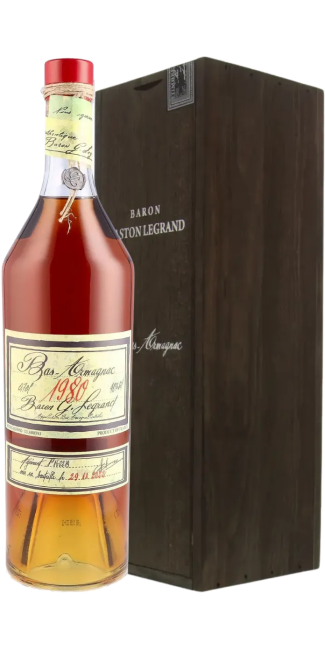 The Bas-Armagnac Baron Gaston Legrand 1980 seduces with its fresh and indulgent aromatic profile, revealing hints of orange zest, candied apricot, acacia honey, and vanilla, subtly enriched with notes of blond tobacco and sweet spices. On the palate, its silky and elegant attack offers a creamy texture, revealing a perfect balance between the roundness of ripe fruit, the sweetness of spices, and the harmonious structure of controlled aging in oak barrels. The finish is long and balanced, leaving an impression of candied fruit, vanilla, and a touch of rancio, confirming the nobility of this exceptional vintage, heir to a passionately preserved Gascon artisanal know-how.