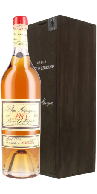 The Bas-Armagnac Baron Gaston Legrand 1983 seduces with its powerful yet elegant nose, where aromas of fresh walnuts, candied prunes, ferns, and vanilla intermingle, enhanced by subtle notes of candied fruit and sweet spices. On the palate, it offers a round and generous texture, revealing a perfect harmony between the roundness of ripe fruit, the sweetness of spices, and the structure of controlled aging in oak barrels. The long and persistent finish ends with hints of honey, vanilla, and a touch of rancio, confirming the nobility of this exceptional vintage, the fruit of Gascon expertise preserved with passion.
